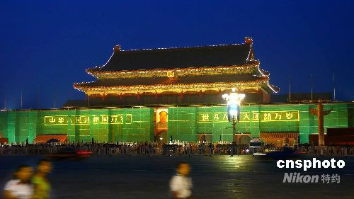 8月28日晚,粉刷中的北京天安門(mén)城樓在夜幕下別樣美麗。近日為迎接北京殘奧會(huì)和“十一”國(guó)慶節(jié)到來(lái),天安門(mén)城樓開(kāi)始加裝圍擋,進(jìn)行粉刷施工。據(jù)悉今年粉刷工作將在殘奧會(huì)前完工。中新社發(fā) 張愛(ài)東 攝