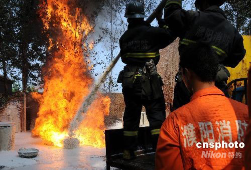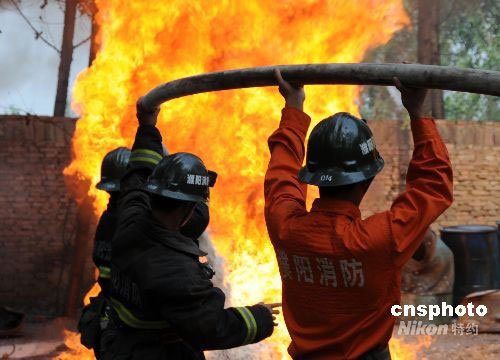 8月28日,河南濮陽(yáng)市疙瘩廟村一家地下非法小煉油作坊在廢油加工時(shí),操作不慎引發(fā)火災(zāi)。大火炙烤著現(xiàn)場(chǎng)10多個(gè)裝滿(mǎn)易燃品的原料罐,并威脅著周?chē)罕姷纳?cái)產(chǎn)安全。濮陽(yáng)市消防支隊(duì)華龍區(qū)大隊(duì)官兵接報(bào)后,迅速趕到現(xiàn)場(chǎng),經(jīng)過(guò)1小時(shí)激戰(zhàn),終將大火撲滅。中新社發(fā) 劉敬寬 攝