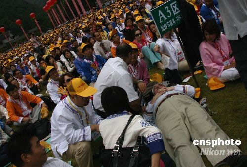 9月12日上午,2008年中國湖南國際旅游節(jié)在張家界國家森林公園開幕,湖南借助國際旅游節(jié)這一機遇向世界展示自身獨特的旅游資源和旅游產(chǎn)業(yè)發(fā)展狀況。500余名境內(nèi)外旅行商和媒體記者受邀觀看開幕式表演,一位胖老外坐著看覺得不舒服,直接躺在草地上,引起了一場小誤會。中新社發(fā) 張家根 攝