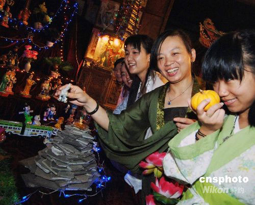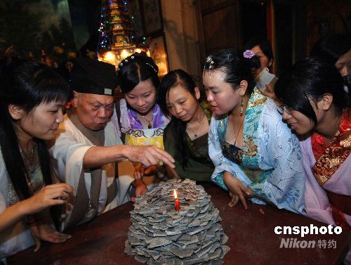 9月13日,五十多名福建漢服愛好者在福州名勝裴仙宮舉行擺塔慶中秋,重現(xiàn)福州民俗。據(jù)傳“擺塔”源于明嘉靖年間戚繼光奉命來閩抗倭,連打幾場大勝戰(zhàn)。有一次正逢中秋節(jié),為慶祝勝利,人們把古玩等擺在廳堂供人欣賞。過去福州的塔比較多,擺設(shè)品多為古塔狀,故稱“擺塔”。中新社發(fā) 劉可耕 攝