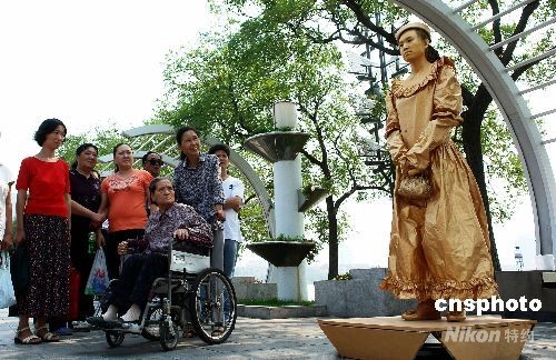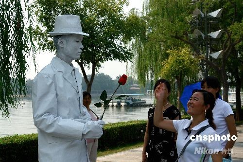 9月14日,在天津水上公園中秋游園會上,由四人組成的人體活雕塑展成了亮點。這些人體活雕塑在進(jìn)行表演的同時,還與游客合影、互動,給中秋游園會增添了靚麗風(fēng)景。中新社發(fā) 展曉仁 攝