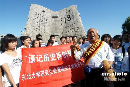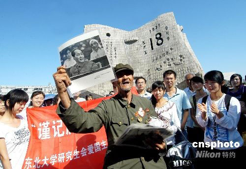 9月18日,許多當(dāng)年抗日戰(zhàn)士、“九一八”事變受害者,紛紛聚集在遼寧沈陽“九一八”歷史博物館殘歷碑前,訴說慘痛歷史,對年輕一代進行愛國主義教育。中新社發(fā) 文契 攝
