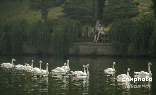 9月23日,天鵝在西湖湖面暢游。當(dāng)日,28只天鵝在闊別西湖3年后重返西湖。據(jù)了解,2005年秋天,有關(guān)部門在西湖孤山處放養(yǎng)了80只白天鵝,為西湖增添了一道風(fēng)景。但后來因?yàn)閭別地方出現(xiàn)禽流感,有關(guān)部門就把白天鵝圈養(yǎng)了起來。中新社發(fā) 引煒 攝