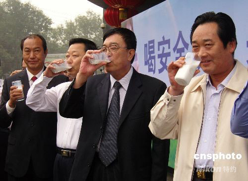 9月25日,在石家莊市最繁華的先天下購物廣場,該市副市長張殿奎(右二)帶頭將滿滿一大杯某品牌純牛奶一飲而盡,隨行的石家莊市工商局、質(zhì)量技術(shù)監(jiān)督局、商務局等相關(guān)部門負責人也紛紛效仿,將手中品牌各異的滿杯純牛奶全部喝下,以消除此間民眾因三鹿問題奶粉事件而產(chǎn)生的顧慮。