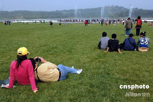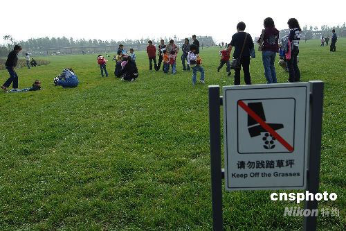 9月29日,北京奧林匹克森林公園露天劇場大草坪被迫準(zhǔn)許游人進入休閑,草坪大面積遭到踐踏。北京殘奧會閉幕后,該草坪在禁止游人進入時,一直有游客違規(guī)強行進入,并不斷與保安人員發(fā)生沖突。鑒于近期警員、保安、志愿者紛紛休假離去,森林公園管理機構(gòu)正式撤除了草坪阻攔線,默許游人在此行走,滯留。中新社發(fā) 鄒憲 攝