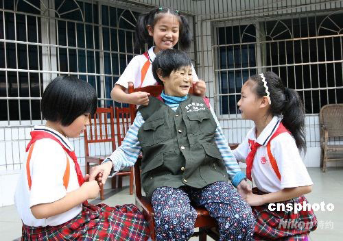 10月7日,由四川省廣安市廣安區(qū)東方小學(xué)的10多名少先隊(duì)員組成的愛(ài)心志愿者小分隊(duì)來(lái)到濃洄敬老院,看望生活在這里的40多位老人,為老人送上節(jié)日禮物,為老人打掃房間,陪老人聊天、散步,為他們送去重陽(yáng)節(jié)的祝福,陪伴他們度過(guò)災(zāi)后首個(gè)重陽(yáng)節(jié)。 中新社發(fā) 杜修戰(zhàn) 攝