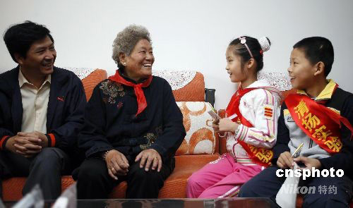 10月7日重陽節(jié),無錫市清揚(yáng)實(shí)驗(yàn)小學(xué)為提高少先隊(duì)員尊老、敬老、愛老意識,進(jìn)一步營造全社會(huì)尊老愛老氛圍,結(jié)合“喜看家鄉(xiāng)改革開放30年巨變”,開展“和諧小使者訪名人”活動(dòng)。在世界上第一個(gè)從北坡登上珠峰的女英雄——潘多的家中,無錫市清揚(yáng)實(shí)驗(yàn)小學(xué)的少先隊(duì)員們與潘多奶奶面對面地交流著。潘多奶奶勉勵(lì)少先隊(duì)員要在學(xué)習(xí)上要發(fā)揚(yáng)“攀登”精神,克服困難,勇攀學(xué)習(xí)高峰。 中新社發(fā) 張浩 攝