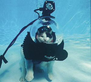 據(jù)英國媒體12日?qǐng)?bào)道,美國男子吉恩·艾爾巴是一名潛水愛好者,為了讓自己家的寵物狗穆特雷、寵物貓霍凱爾也能夠和他一起在海底潛水遨游,艾爾巴苦心研究,發(fā)明出了一種神奇的“動(dòng)物潛水服”,穿上這種神奇潛水服后,他家的寵物貓和寵物狗也能潛入水底,充分享受海底探險(xiǎn)的樂趣了。