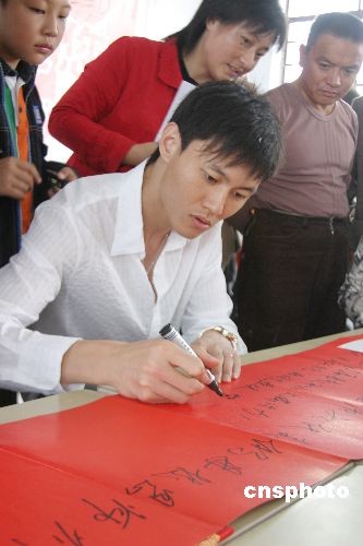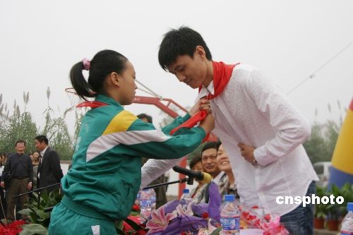 2008年10月19日,北京奧運佩劍冠軍仲滿回到家鄉(xiāng)母校江蘇海安縣大公鎮(zhèn)北凌小學和北凌初中,回顧自己獲得冠軍的歷程,并為師生簽名、合影,感謝母校對他的培育。中新社發(fā) 江蘇-徐瑞平 攝