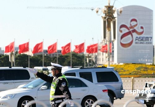 2008年10月23日,交警在北京天安門廣場為第七屆亞歐首腦會議代表抵京執(zhí)勤。據(jù)悉,24日至25日,第七屆亞歐首腦會議在北京舉行。為確保亞歐首腦會議順利進(jìn)行,保證交通安全暢通,北京市公安局近日發(fā)布通告,會議期間,將對部分地區(qū)及道路分時、分段采取臨時交通管制措施。中新社發(fā) 魯谷 攝