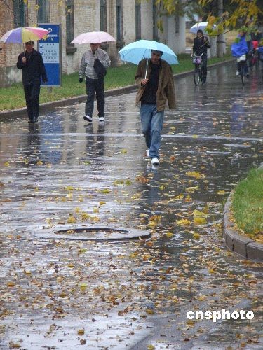 10月23日,齊齊哈爾市民走在深秋的雨中。當日,齊齊哈爾市出現降雨降溫天氣。中新社發(fā) 王云龍 攝