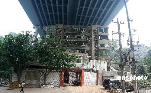 圖為重慶渝黔高速路南山立交橋下的一幢6層居民樓,此樓樓頂立交橋,背倚橋柱,在網(wǎng)上被稱(chēng)為“終年曬不到太陽(yáng)、淋不到雨的最牛的樓房”。而近日這棟“最牛樓房”還未拆遷,旁邊卻又要開(kāi)建新房,引起了廣大市民的熱議。中新社發(fā) 孫須 攝