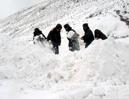 受持續(xù)強降雪和雪崩影響,川藏公路西藏境內(nèi)東達山至牛踏溝部分路段交通中斷。擔(dān)負川藏公路竹東段養(yǎng)護保通任務(wù)的武警交通部隊緊急啟動搶險預(yù)案,出動機車、兵力趕赴受災(zāi)現(xiàn)場全力搶通道路。 新華社記者 葉輝 攝