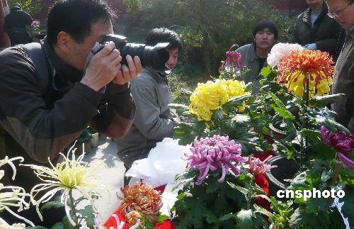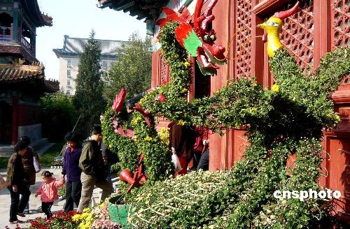 11月1日,為期20天的第29屆北海公園菊花展在北京皇家園林北海闡福寺開幕,2008北海公園菊花展以“鳳舞金秋妍”為主題,共展出500余個(gè)品種的2萬多盆菊花,主展區(qū)采用鮮切花方式裱扎楷、草、篆、隸四種不同字體的“菊”字,并設(shè)置六大展室,展出的品種有大立菊、盆景菊、懸崖菊、造型菊及藝菊小品等。中新社發(fā) 錢興強(qiáng) 攝