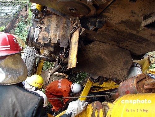 11月2日11時50分許,渝黔高速公路重慶至一品段10公里處,一輛長江牌吊車因爆胎導(dǎo)致車輛失控,沖出護(hù)欄發(fā)生側(cè)翻,造成1人死亡,1人重傷。圖為消防人員緊急施救。中新社發(fā) 郭晉嘉 攝