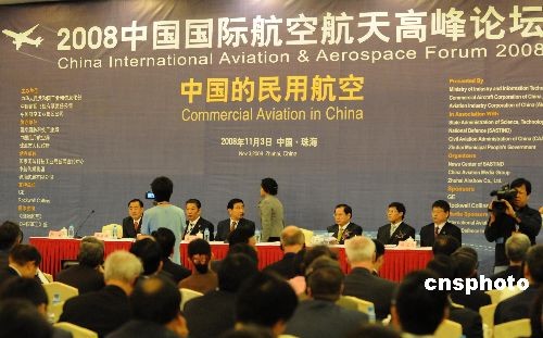 十一月三日,珠海航展開(kāi)幕前夕,由中國(guó)工業(yè)和信息化部、中國(guó)商飛公司、中國(guó)航空工業(yè)集團(tuán)公司共同主辦的二零零八中國(guó)國(guó)際航空航天高峰論壇在珠海舉行,論壇分“中國(guó)民用航空發(fā)展線路圖”、“通用航空與區(qū)域航空的發(fā)展”兩個(gè)單元,中外航空航天界近三百名精英人士相聚一堂,共商未來(lái)發(fā)展大計(jì)。中新社發(fā) 孫自法 攝