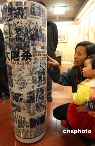 十一月四日,一件由百余幅南京大屠殺史實(shí)圖片燒制成的陶瓷作品《南京大屠殺》在北京汲古閣舉行的《繼承與創(chuàng)新景德鎮(zhèn)大師陶瓷精品展》上展出。由中國陶藝大師蔡世文創(chuàng)作的陶瓷作品《南京大屠殺》賦予陶瓷藝術(shù)崇高的靈魂,將中國古典文化與中華悲慘歷史相結(jié)合,給人以震撼。該作品榮獲08屆“瓷都杯”全國陶藝大賽金獎(jiǎng)。中新社發(fā) 史利 攝