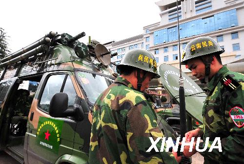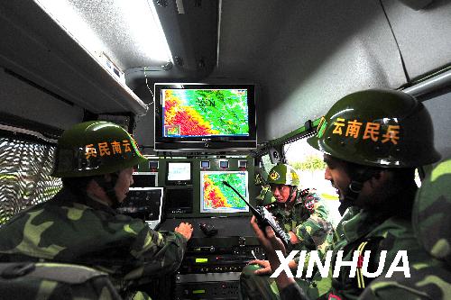 在云南楚雄等地發(fā)生滑坡泥石流災(zāi)害后,云南民兵預(yù)備役應(yīng)急通信分隊(duì)派出安裝著地理信息、GPS定位、衛(wèi)星圖像傳輸、微波無線通信等車載工作系統(tǒng)組合的移動指揮車及數(shù)輛前方信息偵察車,用科技手段為救災(zāi)工作提供精確信息和清晰圖像。新華社記者 陳海寧 攝