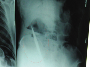 6日上午,記者在徐州礦務(wù)集團(tuán)總醫(yī)院重癥監(jiān)護(hù)室見到了這名男子,目前他雖然已經(jīng)恢復(fù)了意識(shí),但還不能開口說(shuō)話,需要呼吸機(jī)輔助呼吸。據(jù)醫(yī)生介紹,4日中午12時(shí)左右,這名男子因服毒輕生被緊急送到醫(yī)院進(jìn)行搶救,之前,這名男子已經(jīng)在當(dāng)?shù)剜l(xiāng)鎮(zhèn)醫(yī)院進(jìn)行了近20小時(shí)的治療,但效果不佳!安∪吮晦D(zhuǎn)院到礦總院時(shí)已神志不清,血壓極低,處于休克狀態(tài)!本茸o(hù)人員給男子洗胃、初步處理以后,發(fā)現(xiàn)男子呼吸急促,于是趕緊給他拍片檢查。結(jié)果讓所有的醫(yī)生大吃一驚,竟有一把尖狀異物橫在該男子腹腔內(nèi)!當(dāng)天下午5時(shí)30分,輕生男子被推上了手術(shù)臺(tái)。經(jīng)過(guò)40多分鐘的手術(shù),該男子腹腔被打開,手術(shù)醫(yī)生發(fā)現(xiàn),男子體內(nèi)的金屬狀異物竟然是一把長(zhǎng)19厘米的尖刀!