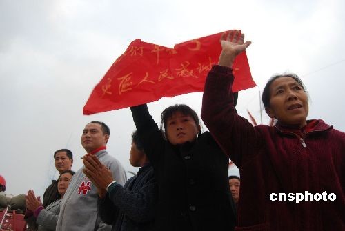 11月10日上午,在北茂公路擂禹段戰(zhàn)斗了180天的第二炮兵某工程團(tuán)撤離災(zāi)區(qū),踏上歸途,綿陽各界群眾到公路沿線為官兵們送行。據(jù)四川省軍區(qū)參謀長張培敏少將介紹,這支部隊(duì)是迄今為止,堅(jiān)守四川災(zāi)區(qū)時(shí)間最長的一支救災(zāi)部隊(duì),也是最后一支撤離的解放軍部隊(duì)。中新社發(fā) 胥輝 攝