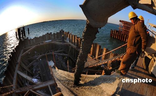 背景資料:曹妃甸特大橋是遷曹鐵路全線重點控制工程,全長7477.26m,為雙線橋梁,包括下部結(jié)構(gòu)樁基1973根、橋墩臺243個,以及相應(yīng)施工便道、筑島平臺填筑和跨1400m的納潮河段施工棧橋、平臺搭設(shè);上部結(jié)構(gòu)現(xiàn)澆4處15孔共339.44m,架設(shè)預(yù)制梁227孔?缂{潮河段水深6至18m,納潮河主跨連續(xù)箱梁施工是重中之重,原設(shè)計為(40+64+40)分段懸臂澆注施工。該工程于2008年4月中旬開工,面對工期緊、任務(wù)重、安全和質(zhì)量風(fēng)險大等諸多重難點問題,從集團公司到項目部各級領(lǐng)導(dǎo)高度重視,層層發(fā)動,統(tǒng)一思想;著力加強現(xiàn)場組織領(lǐng)導(dǎo)力量,加大施工現(xiàn)場人力、物力的投入;不斷優(yōu)化施工方案,嚴(yán)控布控,精心組織,科學(xué)施工,全力攻堅。先后組織了“百日大干,任務(wù)過半”、“決戰(zhàn)60天,貫通曹西線”等建功立業(yè)競賽活動,目前已完成實物工作量95%,預(yù)計2008年底全線貫通。中新社發(fā) 朱鴻山 攝