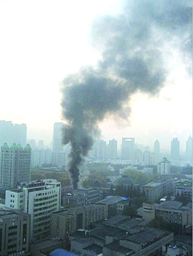 此時(shí),一名工人急匆匆地從電子系實(shí)驗(yàn)樓跑出來,說樓頂?shù)目照{(diào)外機(jī)燒起來了,工人們正在滅火。很快,學(xué)校保衛(wèi)處與相關(guān)部門的工作人員趕到現(xiàn)場,開始疏散周圍的師生。樓頂?shù)暮跓熞苍絹碓酱,現(xiàn)場周圍焦糊味越來越重。