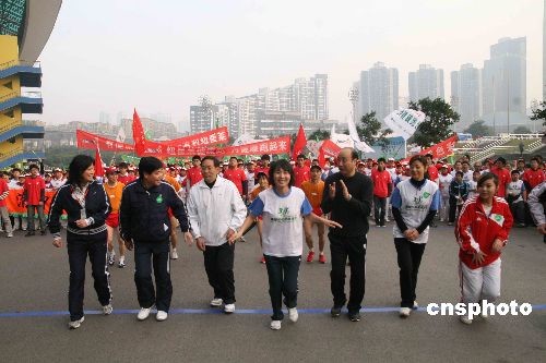 11月29日,“東方神鹿”王軍霞(左四)現(xiàn)身某公司在重慶組織的健康跑活動,帶領(lǐng)萬余名長跑愛好者在初冬時節(jié)“跑起來”。中新社發(fā) 杜遠(yuǎn) 攝