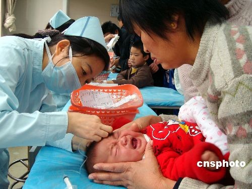 2008年12月4日,蘇州市兒童醫(yī)院的醫(yī)護(hù)人員在為患兒輸液。當(dāng)日,受北方冷空氣影響,蘇州氣溫大幅下降,來醫(yī)院就診的患兒也比平時(shí)增加四成左右,大部分患兒是由于受涼而引發(fā)感冒、發(fā)燒等不適。中新社發(fā) 王建康 攝