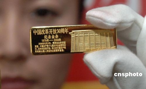 12月10日,由中國(guó)國(guó)家博物館藝術(shù)品開發(fā)中心監(jiān)制、國(guó)道黃金發(fā)行的重大紀(jì)念品--“改革開放30周年紀(jì)念金條”在北京上市。據(jù)悉,國(guó)內(nèi)限量發(fā)行2008套,每套包含兩根Au9999金條,每根重25克。每一套紀(jì)念金條均具有唯一編號(hào)、防偽收藏證書、國(guó)家權(quán)威部門出具的鑒定證書等資料。中新社發(fā) 鄒憲 攝