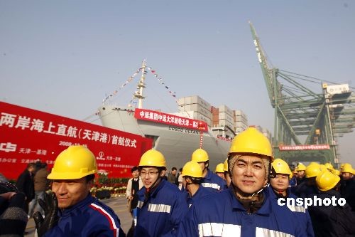 12月15日,海峽兩岸海上直航首航儀式在天津市天津港舉行。據(jù)悉,當(dāng)日舉行首航儀式的,大陸有天津、上海、太倉、福州、廈門、泉州6個港口,臺灣有基隆、高雄2個港口,參加首航的船公司13家,其中大陸9家公司15艘船舶,臺灣4家公司5艘船舶。中新社發(fā) 盛佳鵬 攝