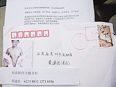 記者隨后趕到郵局看到,信有20多封,一樣的信封,一樣的郵票,一樣的筆跡。收信人是包括蘇州在內(nèi)的全國(guó)各地的民政局長(zhǎng),下面的落款無一例外寫的是“堂妹×××”。打開信封,里面則是一對(duì)男女的裸照。記者發(fā)現(xiàn),這些裸照除了男子的頭像不一樣,其他一模一樣,信是電腦打印的,20多封信的內(nèi)容都一樣,內(nèi)容大概是“您應(yīng)該還記得春宵纏綿的時(shí)刻,還記得妹妹我吧”,“收到信后你必須立即到開戶銀行柜臺(tái)以無折存款的方式,直接存入八萬塊錢”……另外就是一個(gè)叫“周建瓊”的人的銀行賬號(hào)。
