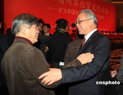 12月20日,第四屆兩岸經(jīng)貿(mào)文化論壇在上海開幕,臺灣記者熱情問候與會(huì)的張銘清(右)先生。中新社發(fā) 潘索菲 攝