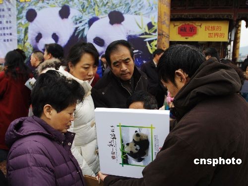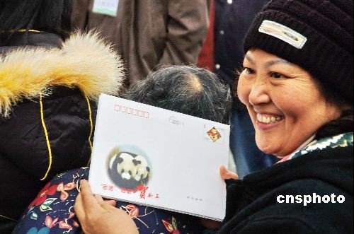12月23日,四川雅安市發(fā)售贈(zèng)臺(tái)大熊貓團(tuán)團(tuán)圓圓相關(guān)郵品。市民排隊(duì)熱情購(gòu)買,雅安市委副書(shū)記張錦明、副市長(zhǎng)譚向紅等現(xiàn)場(chǎng)為市民簽名售郵品。中新社發(fā) 張國(guó)軍 攝