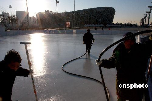 12月31日,北京國(guó)家體育場(chǎng)“鳥巢”旁玲瓏塔下,一塊近1000平方米的空地被厚厚的冰層覆蓋。據(jù)現(xiàn)場(chǎng)施工人員介紹,該場(chǎng)地正在建造溜冰場(chǎng),預(yù)計(jì)冰面能達(dá)到5-6厘米厚,面積約1000平方米,為迎接元旦、春節(jié)“雙節(jié)”來(lái)臨而準(zhǔn)備的臨時(shí)冰場(chǎng),預(yù)計(jì)元旦即可正式對(duì)游客開放。