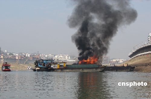 1月3日13時20分許,廣西梧州桂江上一艘貨船突然起火。由于火勢大,貨船噴出的火苗很快點燃?吭谂赃叺牧硪凰邑涊,并危及鄰近10多艘貨輪。梧州消防支隊調(diào)集水上中隊和河?xùn)|中隊官兵奮戰(zhàn)近50分鐘,終于將大火撲滅,事故中無人員傷亡。據(jù)了解,當(dāng)時起火貨船靠岸后船主上岸辦事,不料隨后船艙起火。中新社發(fā) 何永崇 攝