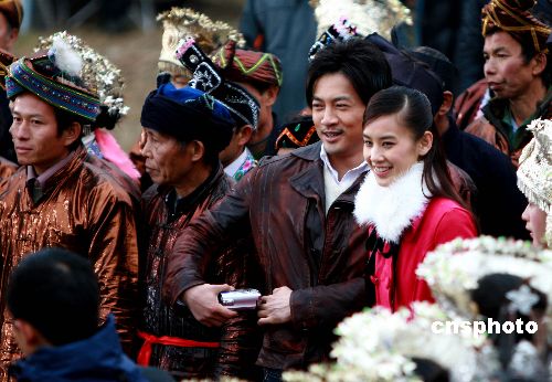 1月7日,在廣西融水苗族自治縣四榮鄉(xiāng)田頭苗寨,知名藝人黃圣依、蘇有朋在拍戲中。近日,《尋找劉三姐》電影劇組來(lái)到廣西融水縣田頭苗寨拍攝外景戲,黃圣依和蘇有亦現(xiàn)身大苗山,出演劇中主要人物。據(jù)了解,電影《尋找劉三姐》由廣西電影制片廠等單位聯(lián)合出品,由黃圣依、蘇有朋主演。中新社發(fā) 龍濤 攝