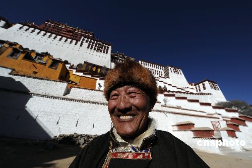 一月十九日,西藏立法機構(gòu)通過一項議案,決定把每年三月二十八日設(shè)為西藏“百萬農(nóng)奴解放紀(jì)念日”,以紀(jì)念五十年前在西藏進行的民主改革。圖為拉薩布達拉宮雪城前,現(xiàn)年七十三歲的昔日農(nóng)奴益西洛追得知此訊表示非常高興。中新社發(fā) 廖攀 攝