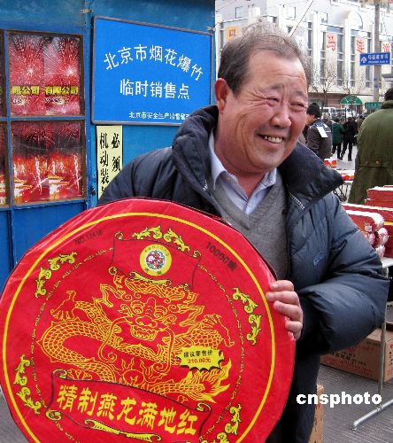2009年1月20日,在京城馬連道煙花爆竹銷(xiāo)售網(wǎng)點(diǎn),人們?cè)谫?gòu)買(mǎi)煙花爆竹。今年北京五環(huán)內(nèi)614家臨時(shí)銷(xiāo)售網(wǎng)點(diǎn)向市民供應(yīng)煙花爆竹,花炮品種比2008年多了不少,而且價(jià)格也降低了10%左右,還增加了奧運(yùn)系列產(chǎn)品。中新社發(fā) 馬毅行 攝