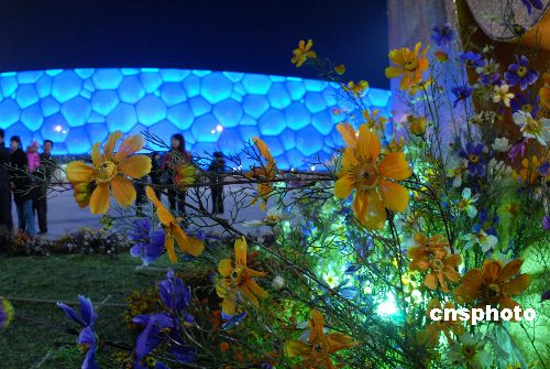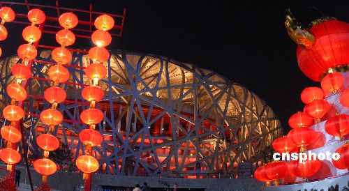 2009年1月31日晚,北京奧林匹克公園迎來(lái)的首個(gè)春節(jié)已過(guò)半,但喜慶氣氛依然高漲,游人絡(luò)繹不絕。最為醒目的是景觀大道兩側(cè)布置兩組15米高的燈籠墻——2800個(gè)大紅燈籠一字排開。此外,“金牛獻(xiàn)!薄ⅰ澳昴暧杏唷、“鴻福滿倉(cāng)”等鋼材結(jié)構(gòu)的雕塑,被安放在園區(qū)人流較集中的地方。中新社發(fā) 胡慶明 攝
