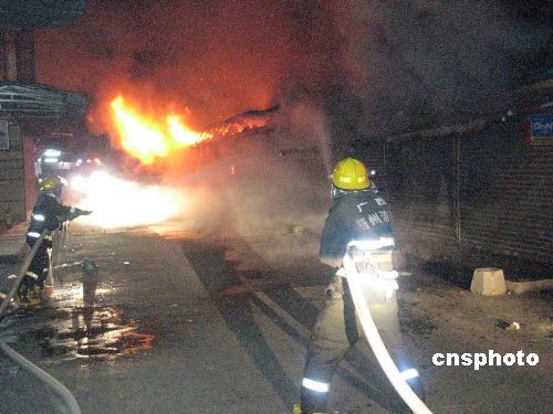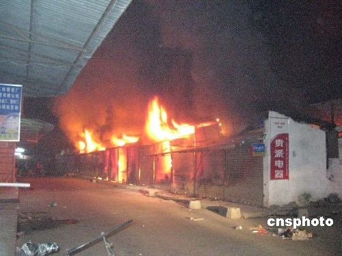 2月7日凌晨3點(diǎn)多,廣西梧州市最大的批發(fā)市場(chǎng)——梧州市兩廣批發(fā)市場(chǎng)B區(qū)發(fā)生大火,12個(gè)鋪面被燒。梧州市消防支隊(duì)緊急出動(dòng)22名官兵趕赴現(xiàn)場(chǎng)救援,大火于5時(shí)24分被成功撲滅。據(jù)了解,該排鋪面內(nèi)銷售的電器設(shè)備幾乎全部被燒毀,無(wú)人員傷亡。目前火災(zāi)損失和火災(zāi)事故原因正在進(jìn)一步調(diào)查中。中新社發(fā) 楊雁 攝