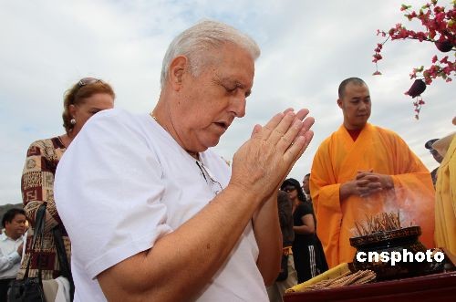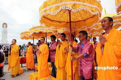 2月9日元宵節(jié),海南三亞南山寺全體僧眾在三亞南山文化旅游區(qū)內(nèi)的108米南海觀音圣像前舉行祈福法會(huì),共唱佛贊,并放飛和平鴿,祈愿國(guó)泰民安、萬(wàn)家團(tuán)圓。本次祈福法會(huì)吸引了近3000多名信眾和游客參加。中新社發(fā) 陳文武 攝