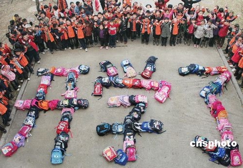 2月15日,外來(lái)務(wù)工人員子女專門(mén)學(xué)校——山東臨沂商城實(shí)驗(yàn)學(xué)校的小學(xué)生用五顏六色的書(shū)包擺出“ 開(kāi)學(xué)了”的字樣造型,歡呼慶祝新學(xué)期開(kāi)學(xué)。中新社發(fā) 王立勝 攝