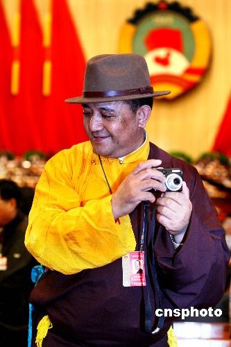 全國政協(xié)十一屆二次會議3月3日下午在人民大會堂開幕,一名少數(shù)民族委員拿著相機在大會上捕捉精彩瞬間。中新社發(fā) 宋吉河 攝
