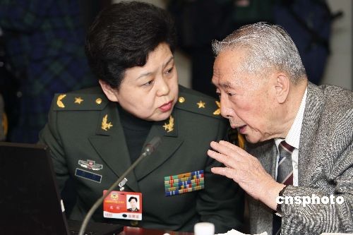 3月4日,全國政協(xié)十一屆二次會議進行分組討論,審議政協(xié)全國委員會常務(wù)委員會工作報告和提案工作情況報告。圖為全國政協(xié)委員、著名外科專家吳蔚然(右)與全國政協(xié)委員、中國人民解放軍總醫(yī)院副院長范利在分組討論上交談。中新社發(fā) 盛佳鵬 攝
