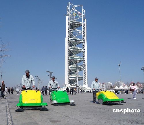 2009年3月8日,幾名保潔員正在使用新型保潔車清掃北京奧林匹克公園的地面。據介紹,北京奧運中心區(qū)新近增添了6部手推保潔車,它操作起來輕便靈活,大大減輕了保潔人員的體力,提高了工作效率。中新社發(fā) 玉龍 攝