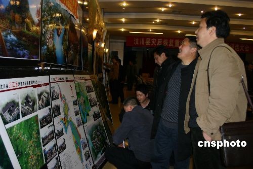 3月11日,為提高災(zāi)后恢復(fù)重建規(guī)劃編制、建設(shè)項目單項設(shè)計的科學(xué)性和嚴謹性,充分發(fā)揮廣大城鄉(xiāng)規(guī)劃及建筑設(shè)計工作者的積極性和創(chuàng)造性,四川地震重災(zāi)區(qū)汶川縣舉行“汶川縣災(zāi)后恢復(fù)重建規(guī)劃設(shè)計優(yōu)秀成果評選活動”。全縣13個鄉(xiāng)鎮(zhèn)的恢復(fù)重建城市設(shè)計方案紛紛亮相,參與評比,征求專家及群眾意見。圖為公眾參觀設(shè)計方案。中新社發(fā) 霍潺 攝
