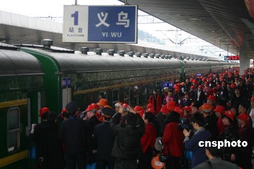 3月12日下午,大陸首個(gè)火車專列赴臺(tái)旅游團(tuán)從浙江義烏出發(fā)。千余名大陸游客將通過火車專列至廈門,渡海過金門后乘飛機(jī)赴臺(tái)灣旅游。據(jù)組織者浙江中旅出境中心總經(jīng)理曹軍介紹,這也是大陸赴臺(tái)旅游人數(shù)最多的單個(gè)團(tuán)隊(duì),本月14日和4月初將還有2000多名游客通過這一方式赴臺(tái)旅游。中新社發(fā) 王旻 攝