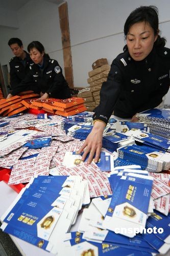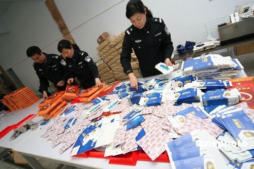 3月18日,河南許昌市魏都公安分局民警在涉嫌制造假藥窩點統(tǒng)計查獲的假藥及藥品標簽、藥盒等。當日,魏都警方接群眾舉報,在一閑置廠房內(nèi)查獲涉嫌制造假藥窩點,當場查扣涉嫌假冒藥品10多種,半成品藥品、包裝箱、合格證、防偽標識等1000多件,涉案值達2000余萬元。假冒藥品有五豆平糖膠囊、腎金子、腎黃金、協(xié)和降脂等10多種,藥效包含降壓、減肥、壯陽滋補等。藥品的制假技術很高,須借助儀器檢測才能區(qū)別。此案正在進一步調(diào)查處理中。中新社發(fā) 牛書培 攝