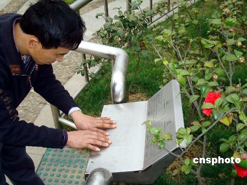 2009年3月19日,盲人在蘇州盲人植物園內(nèi)“手讀”盲文植物介紹。陽(yáng)春三月,春暖花開(kāi),一些盲人來(lái)到蘇州盲人植物園踏青“賞”花。蘇州盲人植物園占地面積12000多平方米,有60多種觀賞植物。每種花草樹(shù)木前都有盲文寫(xiě)的植物介紹,還配有語(yǔ)音輔助系統(tǒng),只要盲人一觸摸,就會(huì)有相應(yīng)的語(yǔ)音服務(wù)為盲人介紹相關(guān)植物知識(shí)。中新社發(fā) 王建康 攝