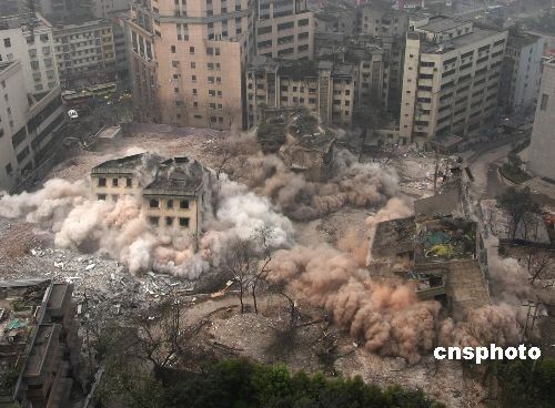 2009年3月21日,重慶江北區(qū)觀音橋處成功進(jìn)行了危舊房定向爆破。當(dāng)日早晨8時(shí),一聲巨響,當(dāng)?shù)赜灞倍宥?hào)地塊的6棟樓房被爆破拆除,總面積1000平方米。這是重慶2009年危舊房改造的第一爆,是觀音橋商圈快速推進(jìn)“長(zhǎng)江上游商貿(mào)中心”的重要舉措。中新社發(fā) 賀終榮 攝